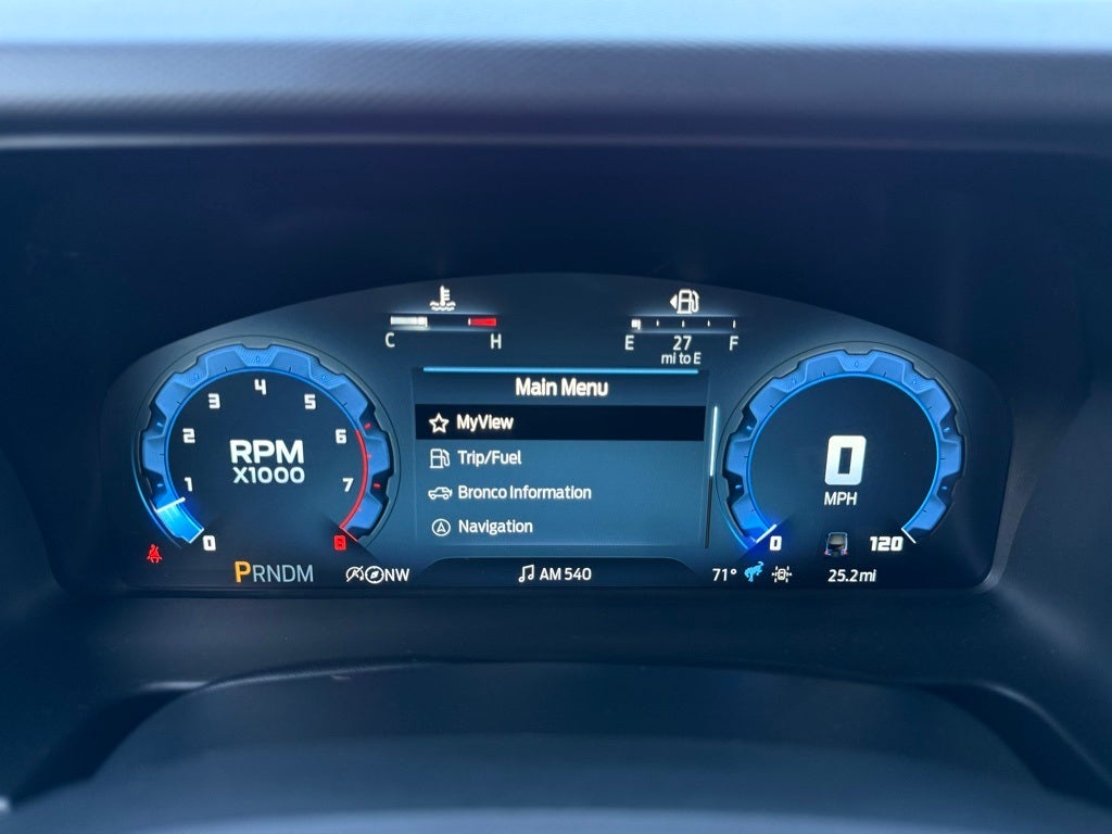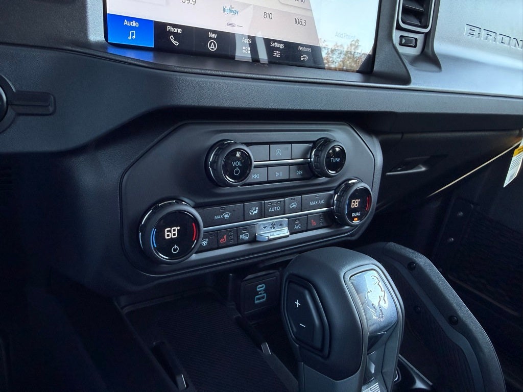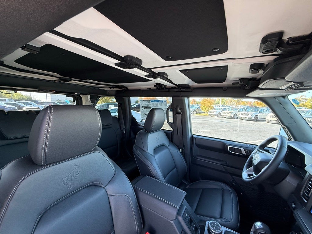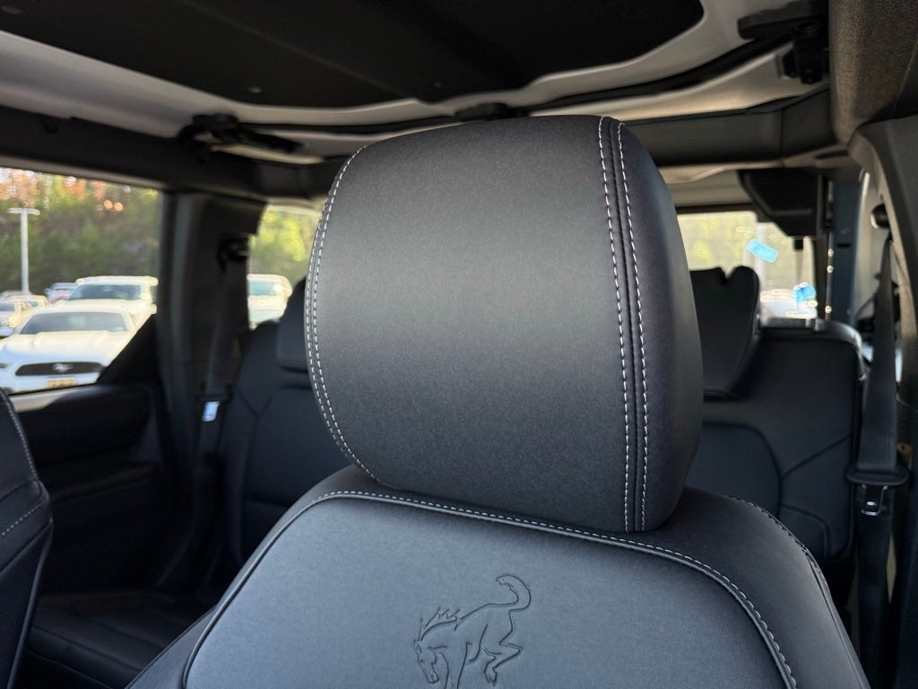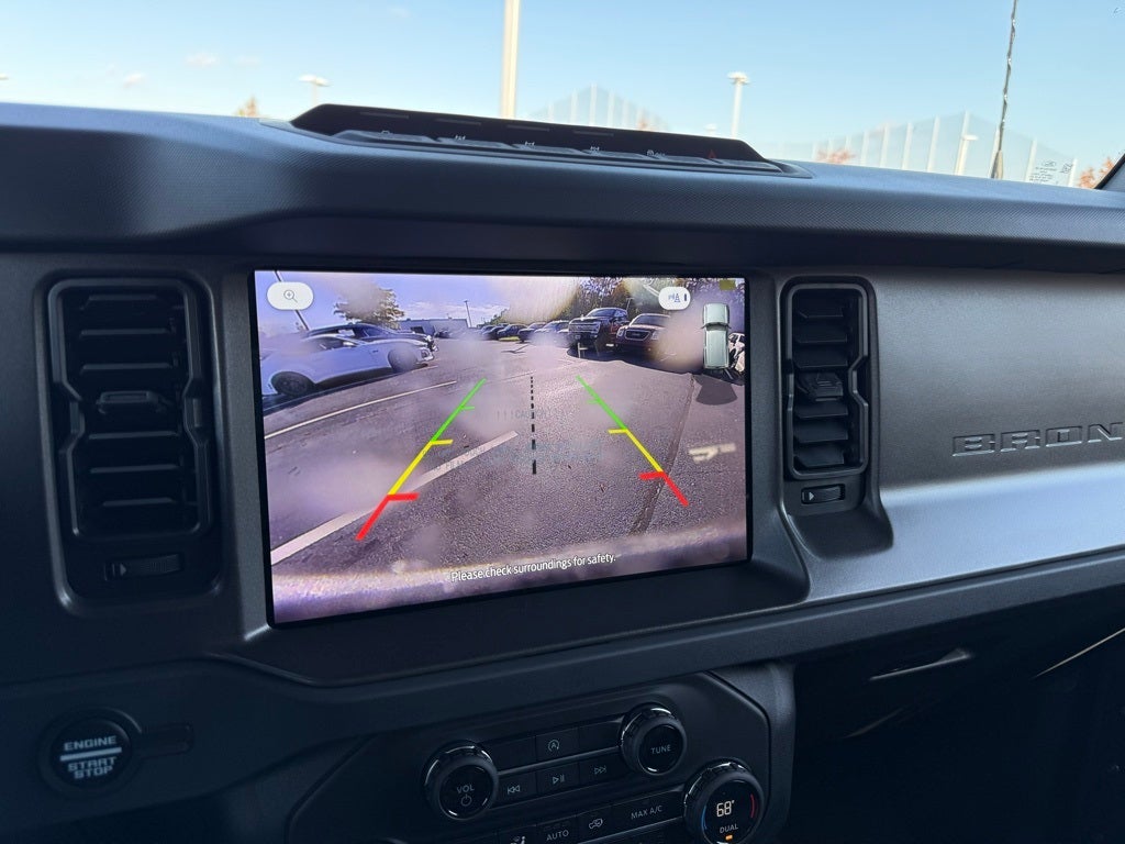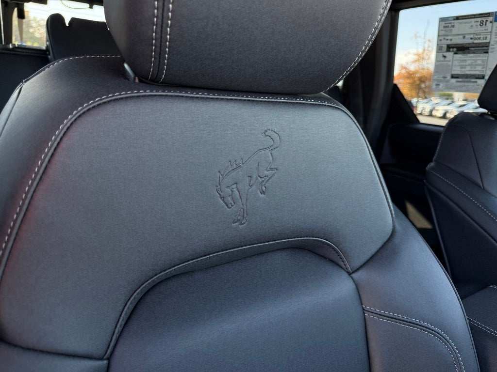 Equipment Group 332A Mid Package (2-Door Intelligent Access w/Lock/Unlock, Ambient Footwell Lighting, Connected Navigation, Dr & Pass Illuminated Sliding Visor Vanity Mirrors, Dual Smart Charging USB Ports, Dual-Zone Electronic Automatic Temperature Control, Power Outlet - Back Side of Center Floor Console, and Rear Parking Sensors), Bronco Badlands, 4D Sport Utility, 4WD, Azure Gray Metallic, Black Onyx, AM/FM Stereo, BLIS Blind Spot Information System, Front fog lights, Fully automatic headlights, Hard Top Sound Deadening Headliner, Heated steering wheel, Lane-Keeping System, Marine Grade Vinyl Heated Bucket Seats, Pre-Collision Assist w/Automatic Emergency Braking, Raptor-Style Running Board, Security system, SiriusXM w/360L, SYNC 4, Wheels: 17 Carbonized Gray-Painted Aluminum, 4-Wheel Disc Brakes, 4.7 Axle Ratio, 7 Speakers, ABS brakes, Air Conditioning, Alloy wheels, Auto High-Beam Headlamps, Auto-dimming Rear-View mirror, Body Color-Painted Hard Top, Brake assist, Compass, Delay-off headlights, Driver door bin, Driver vanity mirror, Dual front impact airbags, Dual front side impact airbags, Electronic Stability Control, Emergency communication system: 911 Assist, Exterior Parking Camera Rear, Front anti-roll bar, Front Bucket Seats, Front Center Armrest, Front License Plate Bracket, Front reading lights, Front wheel independent suspension, Heated door mirrors, Illuminated entry, Integrated roll-over protection, Leather Shift Knob, Low tire pressure warning, Occupant sensing airbag, Outside temperature display, Overhead airbag, Overhead console, Panic alarm, Passenger door bin, Passenger vanity mirror, Power door mirrors, Power steering, Power windows, Radio data system, Rear-View Camera, Rear-Window Defroster & Washer, Remote keyless entry, Speed control, Split folding rear seat, Steering wheel mounted audio controls, Tachometer, Telescoping steering wheel, Tilt steering wheel, Traction control, Trip computer, Variably intermittent wipers, and Voltmeter.