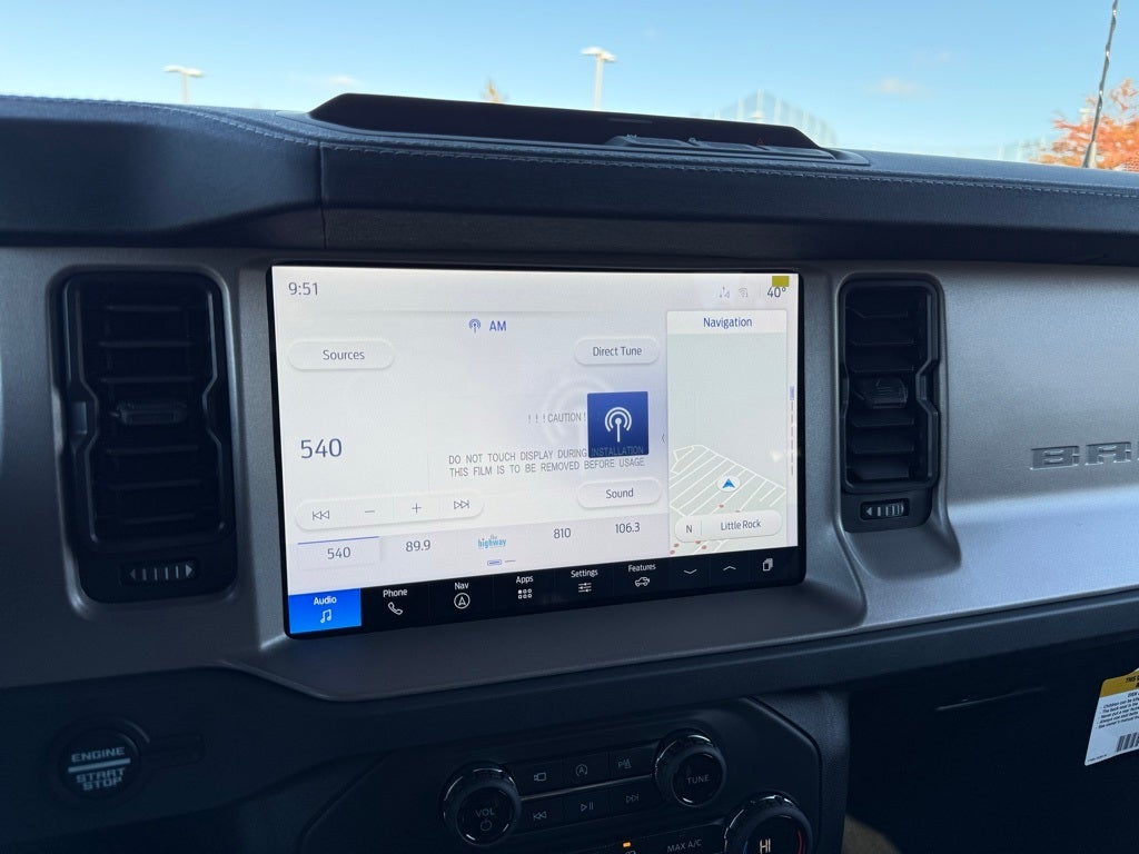 Equipment Group 314A Lux Package (360-Degree Camera, Adaptive Cruise Control, Evasive Steering Assist, Front Parking Sensors, Information on Demand Panel, Radio: B&O Sound System by Bang & Olufsen, Sideview Mirrors, and Universal Garage Door Opener), Bronco Outer Banks Advanced, 4D Sport Utility, 4WD, Desert Sand, Black Onyx Leather, 18 Bright Machined Aluminum Wheels, 4-Wheel Disc Brakes, AM/FM Stereo, Connected Navigation, Exterior Parking Camera Rear, Front dual zone A/C, Front fog lights, Fully automatic headlights, Hard Top Sound Deadening Headliner, Heated Leather-Trimmed/Vinyl Bucket Seats, Heated steering wheel, Navigation system: Connected Navigation, Painted Hard Top, Rear-Window Defroster & Washer, Security system, SiriusXM w/360L, SYNC 4, 3.73 Axle Ratio, 7 Speakers, ABS brakes, Air Conditioning, Alloy wheels, Auto-dimming Rear-View mirror, Automatic temperature control, Brake assist, Compass, Delay-off headlights, Driver door bin, Driver vanity mirror, Dual front impact airbags, Dual front side impact airbags, Electronic Stability Control, Emergency communication system: 911 Assist, Front anti-roll bar, Front Center Armrest, Front License Plate Bracket, Front reading lights, Front wheel independent suspension, Heated door mirrors, Illuminated entry, Integrated roll-over protection, Leather Shift Knob, Low tire pressure warning, Occupant sensing airbag, Outside temperature display, Overhead airbag, Overhead console, Panic alarm, Passenger door bin, Passenger vanity mirror, Power door mirrors, Power driver seat, Power passenger seat, Power steering, Power windows, Radio data system, Rear seat center armrest, Remote keyless entry, Speed control, Split folding rear seat, Steering wheel mounted audio controls, Tachometer, Telescoping steering wheel, Tilt steering wheel, Traction control, Trip computer, Variably intermittent wipers, and Voltmeter.