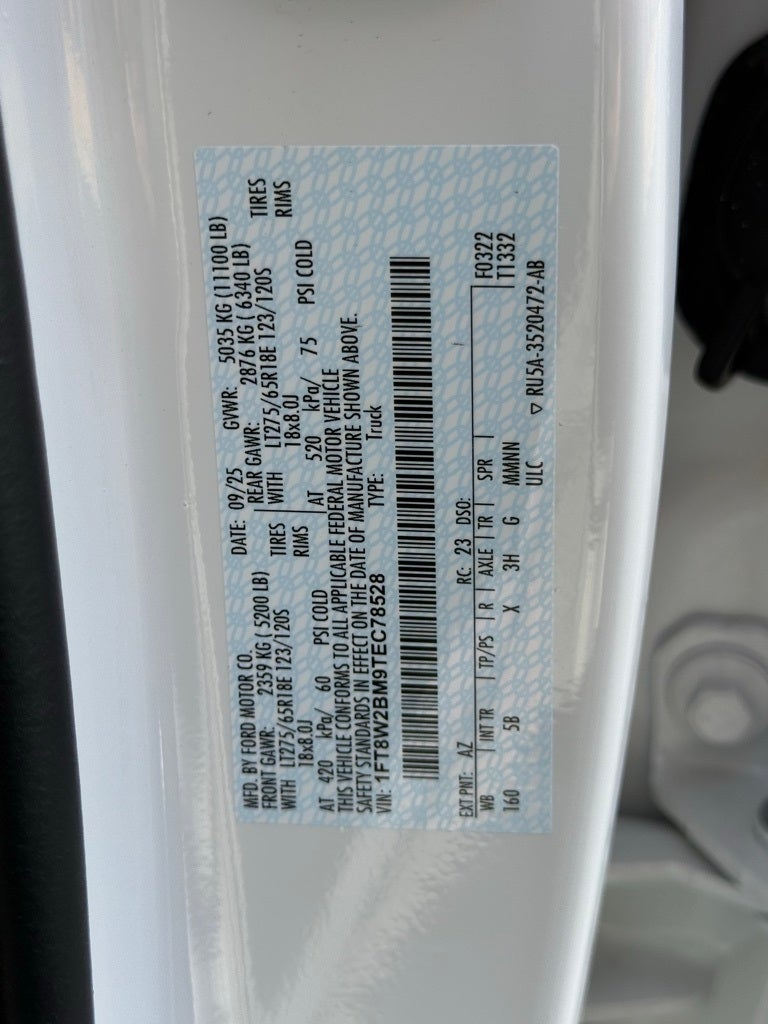 Ford Connectivity Package (1-Year Included), High Capacity 11.6 Axle Upgrade Package, Internet access capable: 5G Modem - Ford Connectivity Package, Order Code 608A (Flow-Through Console and Front ActiveX Trimmed 40/Console/40 Seats), F-250 SuperDuty Lariat, 4D Crew Cab, 6.7L High Output Power Stroke V8 Diesel, 10-Speed Automatic, 4WD, White Metallic, Black Onyx Premium Synthetic, 8 Speakers, Adjustable pedals, Automatic temperature control, Brake assist, Dual AGM 68 AH Battery, Electronic Stability Control, Front Bucket Seats, Front dual zone A/C, Front fog lights, Fully automatic headlights, Heated door mirrors, Heated front seats, Heated rear seats, Heated steering wheel, Illuminated entry, Memory seat, Navigation system: Connected Navigation, Overhead console, Pedal memory, Rear step bumper, Remote keyless entry, Security system, Turn signal indicator mirrors, Ventilated front seats, 4-Wheel Disc Brakes, ABS brakes, Air Conditioning, Alloy wheels, Auto-dimming Rear-View mirror, Bumpers: chrome, Compass, Delay-off headlights, Driver door bin, Driver vanity mirror, Dual front impact airbags, Dual front side impact airbags, Emergency communication system: SYNC 4 911 Assist, Front anti-roll bar, Front Center Armrest, Front License Plate Bracket, Front reading lights, Garage door transmitter, Low tire pressure warning, Outside temperature display, Overhead airbag, Panic alarm, Passenger door bin, Passenger vanity mirror, Power door mirrors, Power driver seat, Power passenger seat, Power steering, Power windows, Privacy Glass, Rain sensing wipers, Rear reading lights, Rear seat center armrest, Rear window defroster, Speed control, Split folding rear seat, Steering wheel mounted audio controls, Tachometer, Telescoping steering wheel, Tilt steering wheel, Traction control, Trip computer, and Variably intermittent wipers.