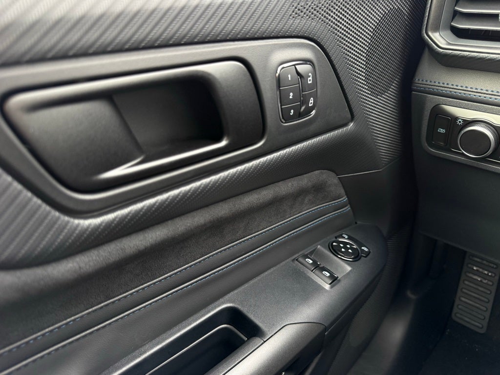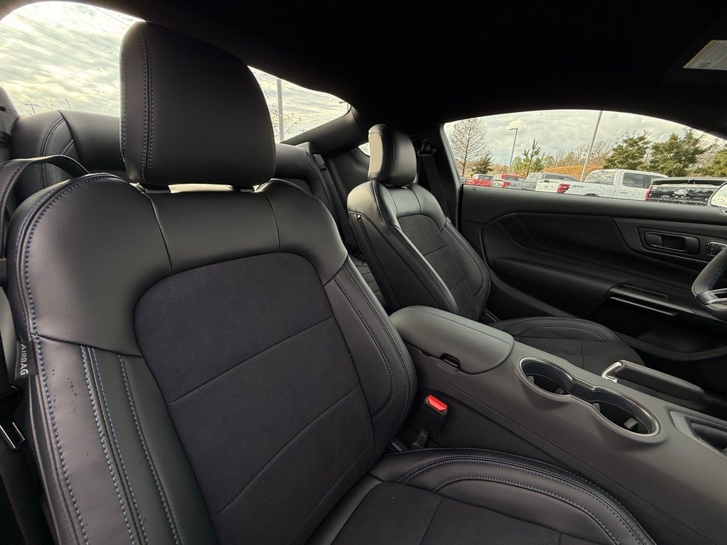 Anti-Theft Package (Active Anti-Theft System, Locking Center Console, and Wheel Locking Kit), Equipment Group 700A Deluxe Package (Aluminum Foot Pedals, AM/FM Stereo, Approach Detection, B&O Sound System by Bang & Olufsen, Cloth/Vinyl Climate-Controlled Bucket Seats, HD Radio, and SYNC 4), Mustang Dark Horse, 2D Coupe, 5.0L V8 DOHC 32V, Tremec 6-Speed Manual, Shadow Black, Black W/Blue Accents Cloth, 12 Speakers, 4-Wheel Disc Brakes, Adaptive suspension, AM/FM radio: SiriusXM with 360L, Automatic temperature control, Brake assist, Electronic Stability Control, Exterior Parking Camera Rear, Four wheel independent suspension, Front Center Armrest, Front dual zone A/C, Fully automatic headlights, Heated steering wheel, Illuminated entry, Navigation system: Connected Navigation, Overhead console, Panic alarm, Power door mirrors, Rear Parking Sensors, Rear window defroster, Remote keyless entry, Speed-sensing steering, Spoiler, Sport steering wheel, Steering wheel mounted audio controls, ABS brakes, Air Conditioning, Alloy wheels, Auto-dimming Rear-View mirror, Bumpers: body-color, Compass, Delay-off headlights, Driver door bin, Driver vanity mirror, Dual front impact airbags, Dual front side impact airbags, Emergency communication system: 911 Assist, Front anti-roll bar, Front reading lights, Knee airbag, Low tire pressure warning, Occupant sensing airbag, Outside temperature display, Overhead airbag, Passenger door bin, Passenger vanity mirror, Power driver seat, Power passenger seat, Power steering, Power windows, Radio data system, Rain sensing wipers, Rear anti-roll bar, Speed control, Speed-Sensitive Wipers, Split folding rear seat, Tachometer, Telescoping steering wheel, Tilt steering wheel, Traction control, Trip computer, Variably intermittent wipers, and Voltmeter.