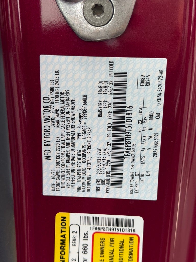 Performance Tires, Parking Sensors, Lane Keep Assist, Backup Camera, Premium Wheels, .3.15 Ration Limited Slip Axle, 235/50ZR 18 BSW All-Season Tire, Ford App, Ford Co-Pilot360, Selectable Drive Modes, Track App, Forward Collision Alert, Mustang EcoBoost, 2D Coupe, Magenta, 1st Row Carpeted Black Floor Mats, 4-Wheel Disc Brakes, 6 Speakers, AM/FM Stereo, Automatic temperature control, Brake assist, Cloth Bucket Seats, Electronic Stability Control, Equipment Group 100A Standard Package, Four wheel independent suspension, Front Bucket Seats, Front Center Armrest, Front dual zone A/C, Fully automatic headlights, Illuminated entry, Overhead console, Radio data system, Rear window defroster, Remote keyless entry, Speed-sensing steering, Sport steering wheel, SYNC 4, Wheels: 18 x 8 Painted Shadow Silver Cast Aluminum.