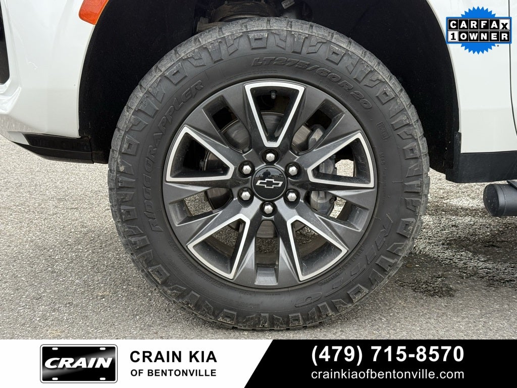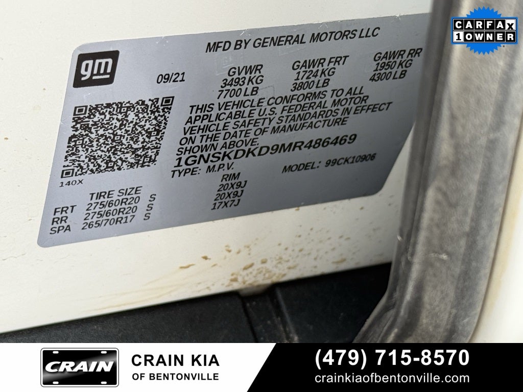 Clean Carfax, One Owner, 10-Way Power Driver & Passenger Seat Adjusters, 1st & 2nd Row Color-Keyed Carpeted Floor Mats, 2 USB Data Ports, 2-Speed Active Electronic AutoTrac Transfer Case, 2nd Row Manual Bucket Seats, 3.23 Rear Axle Ratio, 3rd row seats: split-bench, 4-Wheel Disc Brakes, 9 Speakers, ABS brakes, Air Conditioning, Alloy wheels, AM/FM radio: SiriusXM with 360L, Apple CarPlay/Android Auto, Auto High-beam Headlights, Auto-Dimming Inside Rear-View Mirror, Auto-dimming Rear-View mirror, Automatic temperature control, Black Tubular Assist Steps, Bose 9-Speaker Stereo Audio System Feature, Brake assist, Bright Front & Rear Door Sill Plates, Bumpers: body-color, Color-Keyed Carpeting Floor Covering, Compass, Delay-off headlights, Driver & Front Outboard Passenger Airbags, Driver door bin, Driver vanity mirror, Dual front impact airbags, Dual front side impact airbags, Dual-Pane Power Panoramic Sunroof, Electronic Stability Control, Emergency communication system: OnStar and Chevrolet connected services capable, Floor Console w/Storage Area, Four wheel independent suspension, Front anti-roll bar, Front Bucket Seats, Front Center Armrest, Front dual zone A/C, Front High-Approach Angle Fascia, Front reading lights, Fully automatic headlights, Garage door transmitter, Hands-Free Rear Power Programmable Liftgate, HD Radio, Heated door mirrors, Heated Driver & Front Passenger Seats, Heated front seats, Hill Descent Control, Illuminated entry, Infotainment Display, Leather Seating Surfaces, Leather steering wheel, Leather-Wrapped Steering Wheel, LED Daytime Running Lamps, License Plate Front Mounting Package, Low tire pressure warning, Memory seat, Memory Settings For Driver, Navigation System, Not Equipped w/Automatic Stop/Start, Not Equipped w/Steering Column Lock, Occupant sensing airbag, Outside temperature display, Overhead airbag, Overhead console, Panic alarm, Passenger door bin, Passenger vanity mirror, Power door mirrors, Power driver seat, Power Liftgate, Power passenger seat, Power steering, Power windows, Preferred Equipment Group 2Z7, Premium audio system: Chevrolet Infotainment 3 Plus, Premium Smooth Ride Suspension, Radio: Chevrolet Infotainment 3 Plus System, Radio: Chevrolet Infotainment 3 Premium System, Rain sensing wipers, Rear air conditioning, Rear anti-roll bar, Rear Media & Nav Package, Rear reading lights, Rear seat center armrest, Rear Seat Media System, Rear window defroster, Rear window wiper, Red Recovery Hooks, Remote keyless entry, Remote Start, Roof rack: rails only, Security system, SiriusXM Radio w/360L, Speed control, Speed-sensing steering, Split folding rear seat, Spoiler, Steering wheel mounted audio controls, Tachometer, Telescoping steering wheel, Tilt steering wheel, Traction control, Trip computer, Universal Home Remote, Variably intermittent wipers, Voltmeter, Wheels: 20 x 9 Machined Aluminum.