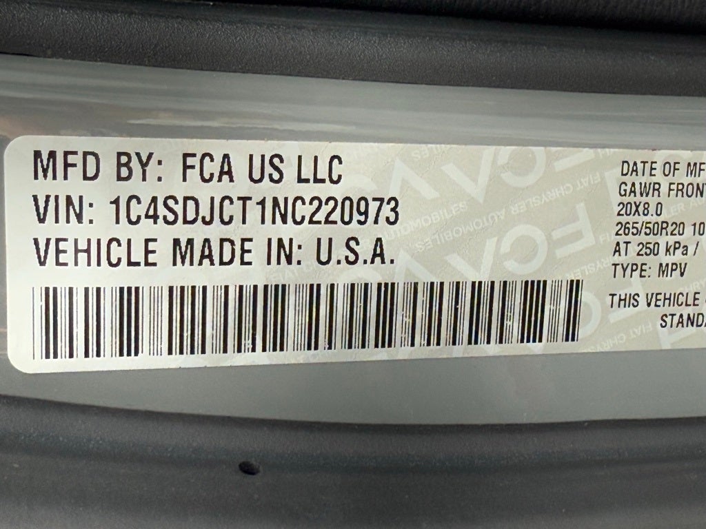 2022 Dodge Durango AWD HEMI 5.7L V8 Multi Displacement VVT 8-Speed Automatic Durango R/T *MIDLIFE HORSEPOWER*, 4D Sport Utility, HEMI 5.7L V8 Multi Displacement VVT, 8-Speed Automatic, AWD, Destroyer Gray Clearcoat, Black Leather, 2nd Row Fold/Tumble Captain Chairs, 2nd Row Mini Console w/Cupholders, 2nd Row Seat Mounted Inboard Armrests, 3.09 Rear Axle Ratio, 3rd row seats: split-bench, 4-Wheel Disc Brakes, 6-Passenger Seating, 9 Speakers, ABS brakes, Air Conditioning, Alloy wheels, AM/FM radio: SiriusXM w/360L, Anti-whiplash front head restraints, Apple CarPlay/Android Auto, Audio memory, Auto High-beam Headlights, Auto-dimming door mirrors, Auto-dimming Rear-View mirror, Auto-leveling suspension, Automatic temperature control, Blacktop Package, Brake assist, Bumpers: body-color, Compass, Delay-off headlights, Driver door bin, Driver vanity mirror, Dual front impact airbags, Dual front side impact airbags, Electronic Stability Control, Emergency communication system: SiriusXM Guardian, Four wheel independent suspension, Front anti-roll bar, Front Bucket Seats, Front Center Armrest w/Storage, Front dual zone A/C, Front fog lights, Front reading lights, Fully automatic headlights, Garage door transmitter, Gloss Black Badges, Gloss Black Exterior Mirrors, Heated door mirrors, Heated front seats, Heated rear seats, Heated steering wheel, Heavy-Duty Engine Cooling, Illuminated entry, Knee airbag, Leather steering wheel, Leather Suede Bucket Seats, Low tire pressure warning, Memory seat, Mini Console 3rd Row Floor Mat, Navigation system: TomTom, Occupant sensing airbag, Outside temperature display, Overhead airbag, Overhead console, Panic alarm, ParkView Rear Back-Up Camera, Passenger door bin, Passenger vanity mirror, Power door mirrors, Power driver seat, Power Liftgate, Power passenger seat, Power steering, Power Sunroof, Power windows, Quick Order Package 22S R/T, Radio data system, Radio: Uconnect 5 Nav w/10.1 Display, Rain sensing wipers, Rear air conditioning, Rear anti-roll bar, Rear Load Leveling Suspension, Rear reading lights, Rear seat center armrest, Rear window defroster, Rear window wiper, Remote keyless entry, Satin Black Dodge Tail Lamp Badge, Security system, Speed control, Speed-sensing steering, Speed-Sensitive Wipers, Split folding rear seat, Spoiler, Steering wheel mounted audio controls, Tachometer, Telescoping steering wheel, Tilt steering wheel, Traction control, Trip computer, Turn signal indicator mirrors, Variably intermittent wipers, Voltmeter, Wheels: 20 x 8.0 Black Noise Aluminum, Wheels: 20 x 8.0 Fine Silver.