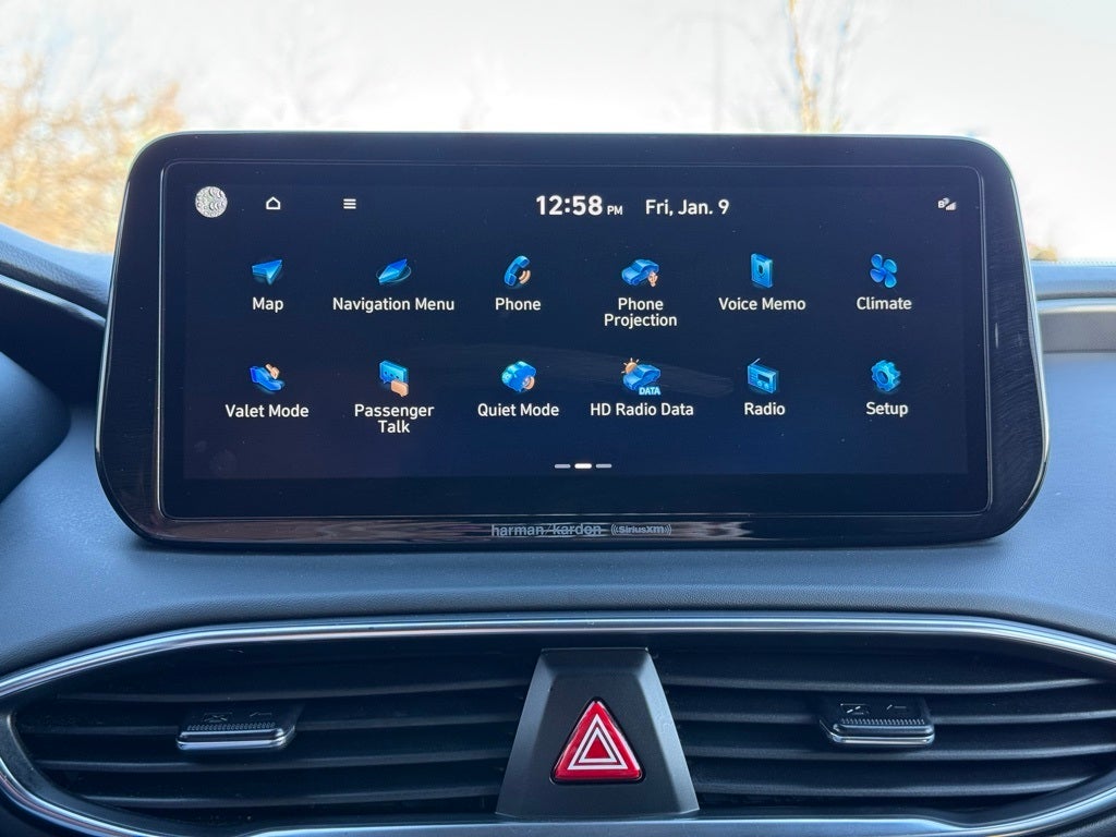 2022 Hyundai Santa Fe AWD I4 Shiftronic AWD, Black Leather, 12 Speakers, 4-Wheel Disc Brakes, ABS brakes, Air Conditioning, Alloy wheels, AM/FM radio: SiriusXM, Apple CarPlay & Android Auto, Auto High-beam Headlights, Auto-dimming Rear-View mirror, Automatic temperature control, Axle Ratio: 3.316, Brake assist, Bumpers: body-color, Cargo Cover/Screen, Cargo Net, Cargo Tray, Carpeted Floor Mats, Delay-off headlights, Driver door bin, Driver vanity mirror, Dual front impact airbags, Dual front side impact airbags, Electronic Stability Control, Emergency communication system, First Aid Kit, Four wheel independent suspension, Front anti-roll bar, Front Bucket Seats, Front Center Armrest, Front dual zone A/C, Front reading lights, Fully automatic headlights, Garage door transmitter: HomeLink, harman/kardon® Speakers, Heads-Up Display, Heated & Ventilated Front Bucket Seats, Heated door mirrors, Heated front seats, Heated rear seats, Heated steering wheel, Illuminated entry, Leather steering wheel, Low tire pressure warning, Memory seat, Occupant sensing airbag, Outside temperature display, Overhead airbag, Overhead console, Panic alarm, Passenger door bin, Passenger vanity mirror, Power door mirrors, Power driver seat, Power Liftgate, Power moonroof, Power passenger seat, Power steering, Power windows, Quilted Premium Nappa Leather Seat Trim, Radio: AM/FM Harman Kardon Display Audio, Rain sensing wipers, Rear anti-roll bar, Rear seat center armrest, Rear window defroster, Rear window wiper, Remote keyless entry, Security system, Speed control, Speed-sensing steering, Split folding rear seat, Spoiler, Steering wheel mounted audio controls, Tachometer, Telescoping steering wheel, Tilt steering wheel, Traction control, Trip computer, Turn signal indicator mirrors, Variably intermittent wipers, Ventilated front seats, Wheels: 20 x 8.0J Alloy. CARFAX One-Owner. Clean CARFAX.