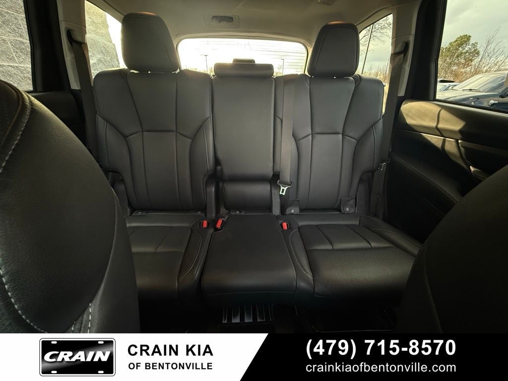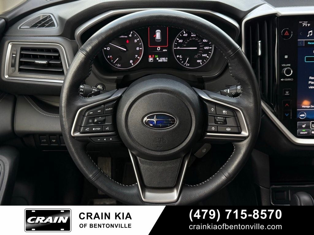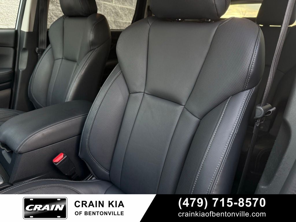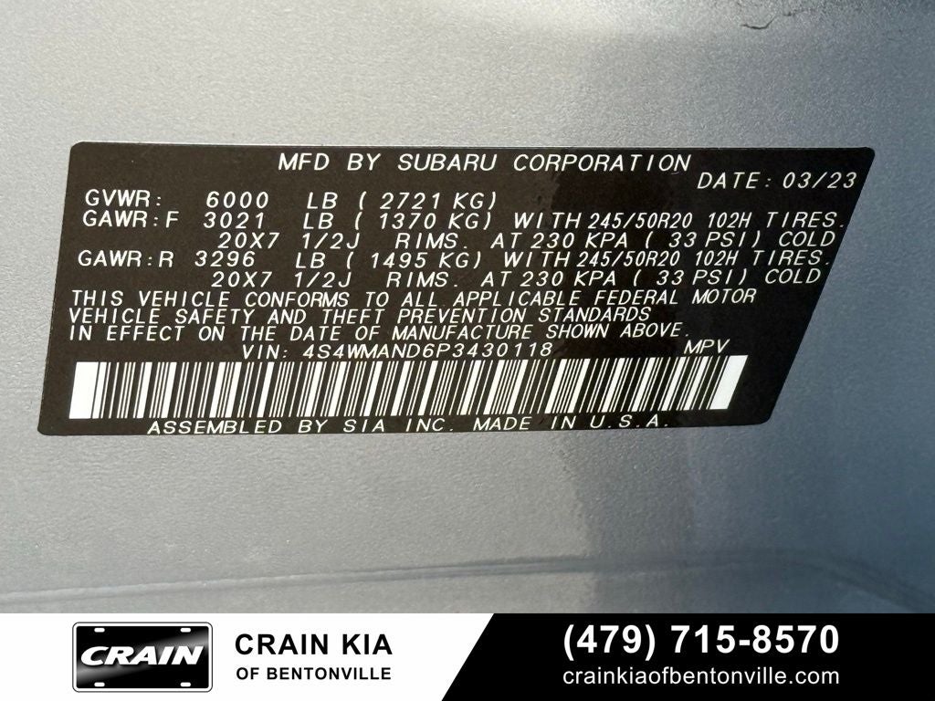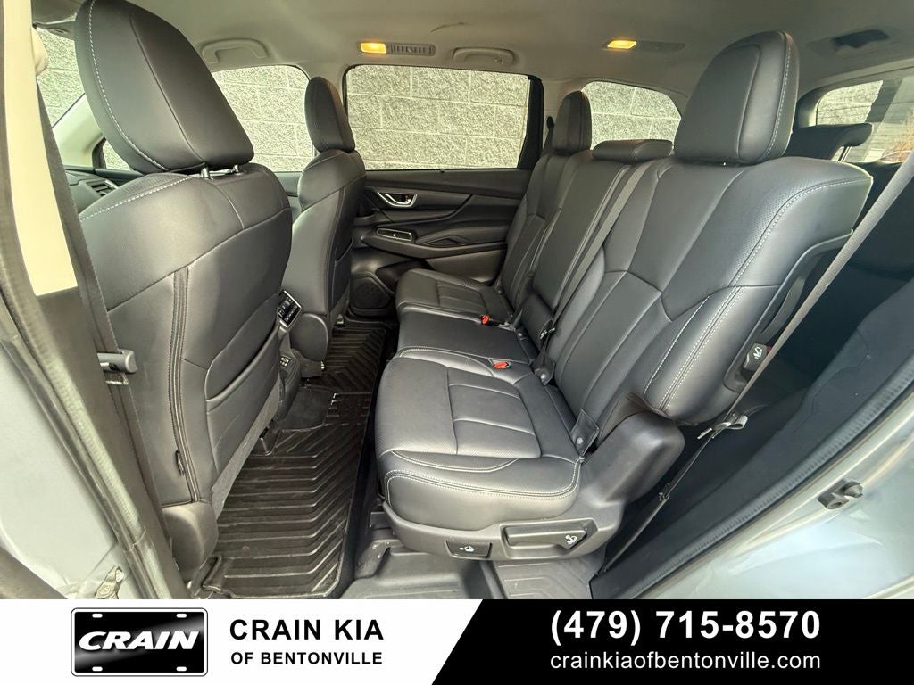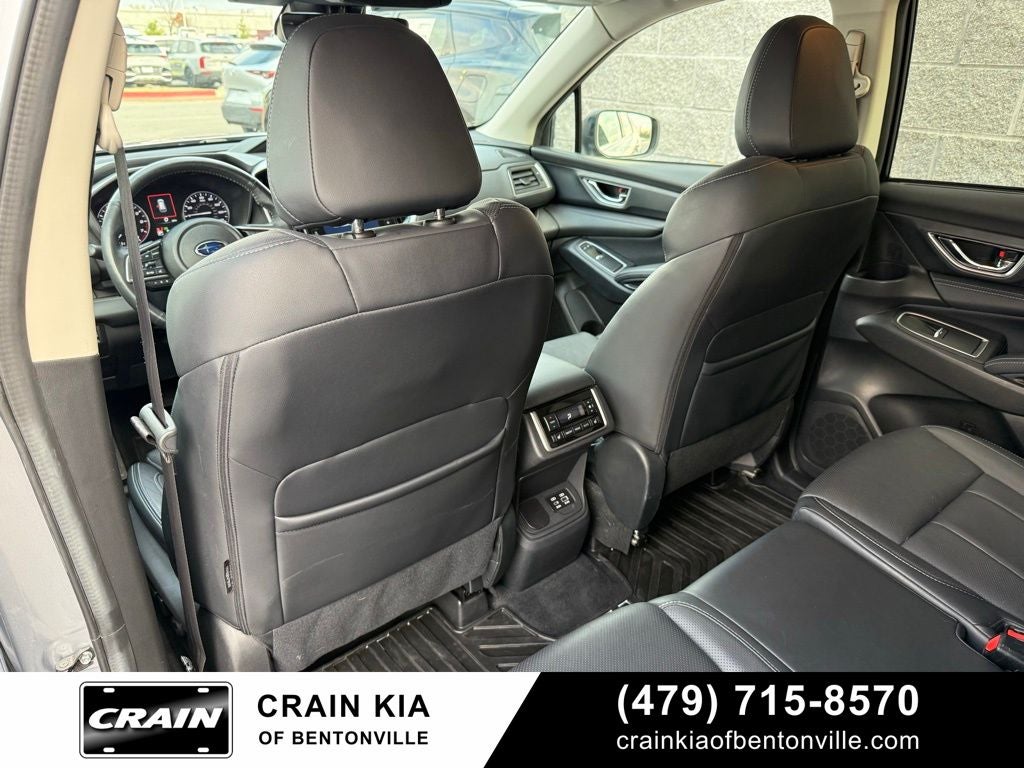 3rd row seats: bench, 4-Wheel Disc Brakes, 6 Speakers, ABS brakes, Air Conditioning, Alloy wheels, AM/FM radio: SiriusXM, Auto High-beam Headlights, Auto-Dimming Exterior Mirror w/Approach Light, Auto-dimming Rear-View mirror, Automatic temperature control, Axle Ratio: 4.44, Brake assist, Bumpers: body-color, Delay-off headlights, Driver door bin, Driver vanity mirror, Dual front impact airbags, Dual front side impact airbags, Electronic Stability Control, Emergency communication system: STARLINK Safety and Security (Subscription Required), Exterior Parking Camera Rear, Four wheel independent suspension, Front anti-roll bar, Front Bucket Seats, Front Center Armrest, Front dual zone A/C, Front fog lights, Front reading lights, Fully automatic headlights, Garage door transmitter: HomeLink, Heated door mirrors, Heated Front Bucket Seats, Heated front seats, Heated rear seats, Heated steering wheel, HVAC memory, Ice Silver Metallic Door Edge Guards, Illuminated entry, Knee airbag, Leather Shift Knob, Leather steering wheel, Low tire pressure warning, Memory seat, Occupant sensing airbag, Outside temperature display, Overhead airbag, Overhead console, Panic alarm, Passenger door bin, Passenger vanity mirror, Perforated Leather-Trimmed Upholstery, Power door mirrors, Power driver seat, Power Liftgate, Power passenger seat, Power steering, Power windows, Radio data system, Radio: Subaru STARLINK 11.6 Multimedia Plus System, Rear air conditioning, Rear anti-roll bar, Rear reading lights, Rear seat center armrest, Rear window defroster, Rear window wiper, Reclining 3rd row seat, Remote keyless entry, Security system, Speed control, Speed-sensing steering, Split folding rear seat, Spoiler, Standard Model, STARLINK/Apple CarPlay/Android Auto, Steering wheel mounted audio controls, Tachometer, Telescoping steering wheel, Tilt steering wheel, Traction control, Trip computer, Turn signal indicator mirrors, Variably intermittent wipers, Wheels: 20 x 7.5 J Dk Gray Alloy w/Machine Finish.