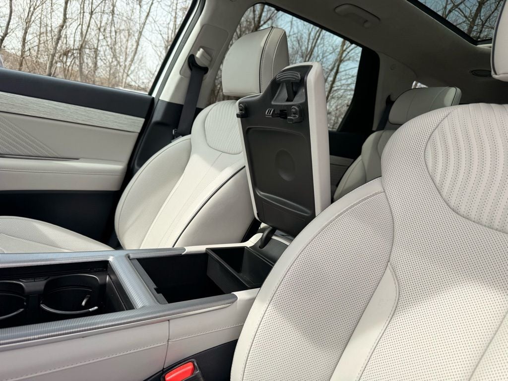 2025 Hyundai Palisade AWD V6 8-Speed Automatic with SHIFTRONIC Palisade Calligraphy, 4D Sport Utility, V6, 8-Speed Automatic with SHIFTRONIC, AWD, White, Beige/Navy Leather, 12 Speakers, 3rd row seats: split-bench, 4-Wheel Disc Brakes, ABS brakes, Air Conditioning, Alloy wheels, AM/FM radio: SiriusXM, Apple CarPlay & Android Auto, Auto High-beam Headlights, Auto-dimming door mirrors, Auto-dimming Rear-View mirror, Auto-leveling suspension, Automatic temperature control, Brake assist, Bumpers: body-color, Carpeted Floor Mats, Compass, Delay-off headlights, Driver door bin, Driver vanity mirror, Dual front impact airbags, Dual front side impact airbags, Electronic Stability Control, Emergency communication system, Exterior Parking Camera Rear, Four wheel independent suspension, Front anti-roll bar, Front Bucket Seats, Front Center Armrest, Front dual zone A/C, Front reading lights, Fully automatic headlights, Garage door transmitter: HomeLink, harman/kardon® Speakers, Heads-Up Display, Heated & Ventilated Front Bucket Seats, Heated door mirrors, Heated front seats, Heated rear seats, Heated steering wheel, Illuminated entry, Knee airbag, Low tire pressure warning, Memory seat, Navigation System, Occupant sensing airbag, Option Group 01, Outside temperature display, Overhead airbag, Overhead console, Panic alarm, Passenger door bin, Passenger vanity mirror, Power door mirrors, Power driver seat, Power Liftgate, Power moonroof, Power passenger seat, Power steering, Power windows, Premium Nappa Leather Seat Trim, Radio data system, Radio: AM/FM/MP3 Premium Audio System, Rain sensing wipers, Rear air conditioning, Rear anti-roll bar, Rear audio controls, Rear reading lights, Rear side impact airbag, Rear window defroster, Rear window wiper, Reclining 3rd row seat, Remote keyless entry, Security system, Speed control, Speed-sensing steering, Split folding rear seat, Spoiler, Steering wheel mounted audio controls, Tachometer, Telescoping steering wheel, Tilt steering wheel, Traction control, Trip computer, Turn signal indicator mirrors, Variably intermittent wipers, Ventilated front seats, Ventilated rear seats, Wheels: 20 x 7.5J Calligraphy Exclusive Alloy. CARFAX One-Owner.